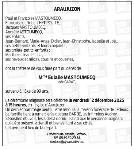 Déroulement des funérailles de Madame Eulalie MASTOUMECQ