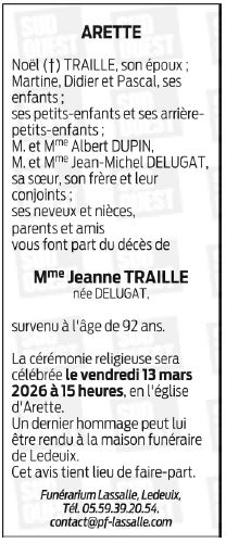 Déroulement des funérailles de Madame Jeanne TRAILLE