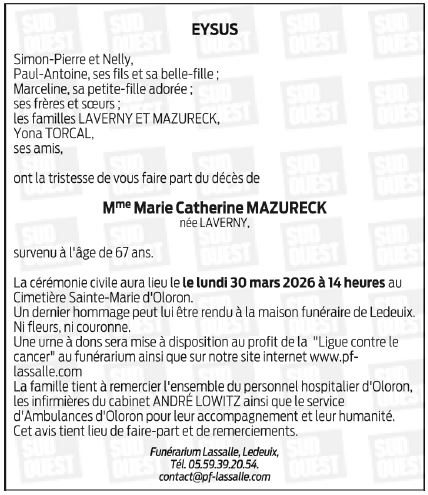 Déroulement des funérailles de Madame Marie-Catherine MAZURECK