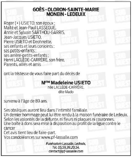 et de partager l'avis de décès de Marie, Madeleine.