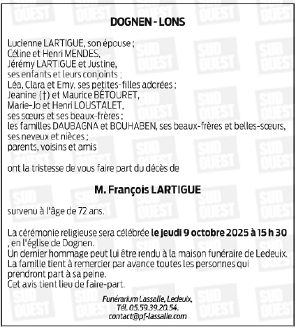 Déroulement des funérailles de Monsieur François LARTIGUE