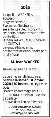 Déroulement des funérailles de Monsieur Jean WACKER